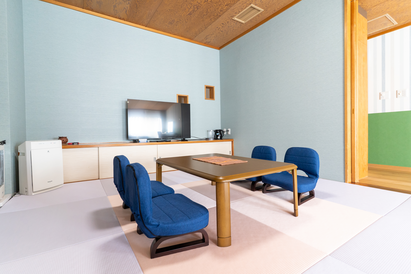 2026年冬にリニューアル。フローリングと畳スペースの段差がないワンフロアタイプのお部屋に生まれ変わりました。靴を脱いで寛ぐスタイルで、小さなお子様連れのお客様も安心快適にお過ごしいただけます。